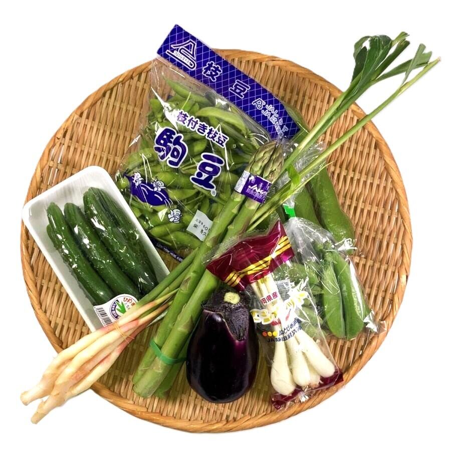 国産 エシャレット1袋 枝豆1袋 スナックエンドウ1袋 つばめ谷中1束 蚕豆5本 水茄子1個 アスパラ1束 ミニ胡瓜1PC