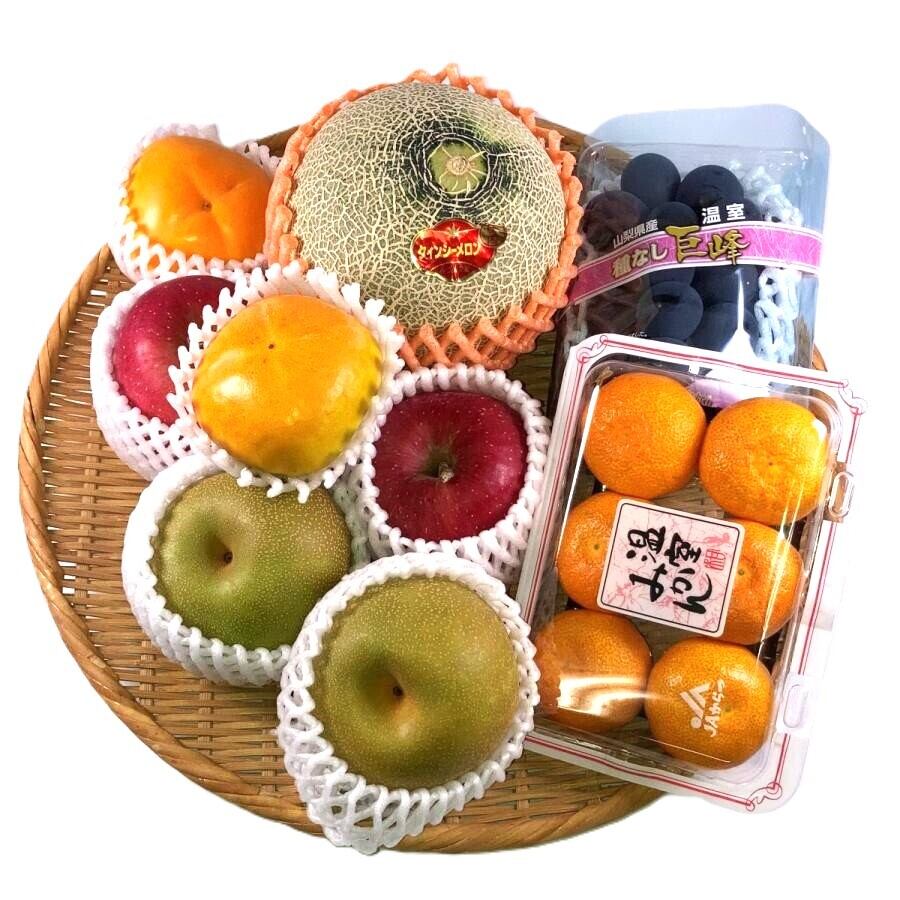 赤肉メロン1個 梨2個 リンゴ2個 柿2個 みかん1PC 種なし巨峰1PC 化粧箱入り